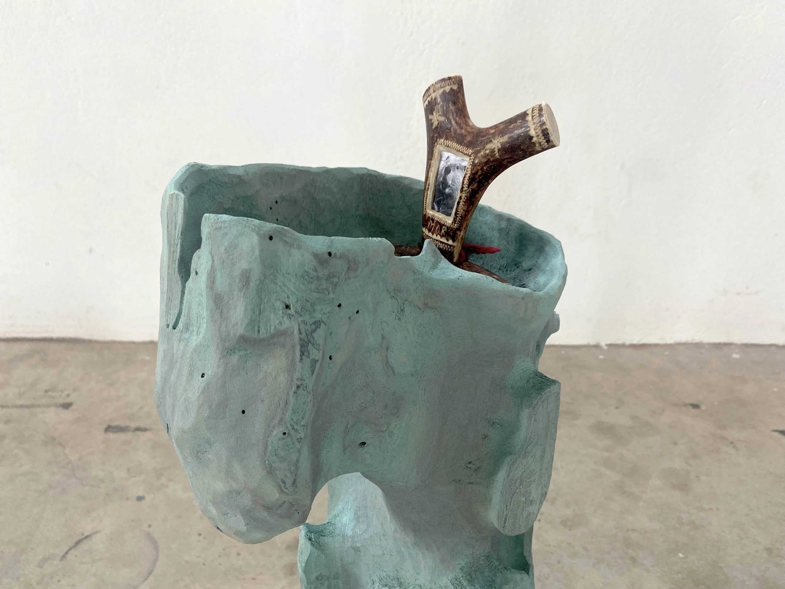 Beaver Hotel, consists of eight wooden sculptures painted with linseed oil, with accompanying elements. Wood craftsmanship, fallen logs and carvings are key elements in the project. The beaver becomes my symbol in exploring wood as material. Initiating the project with a field-trip to Harpefoss, Norway . One of the central wooden sculptures in the exhibition incorporates a film with clips from the forest landscape in Harpefoss, combined with music composed by the duo Helga Myhr (harding fiddle) and Tanja Orning (cello).